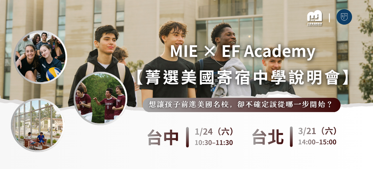 近年越來越多家長與學生關注「海外寄宿高中」作為升學跳板,但真正的關鍵從來不是簡章寫了什麼,而是學生實際在校的生活、學習與適應狀況。 走進 EF Academy 校園!12/27 EFA 學生經驗分享講座本場講座不走官方說明會路線,而是邀請目前就讀 EF Academy 的在校學生親自分享,一起來聽聽看吧!