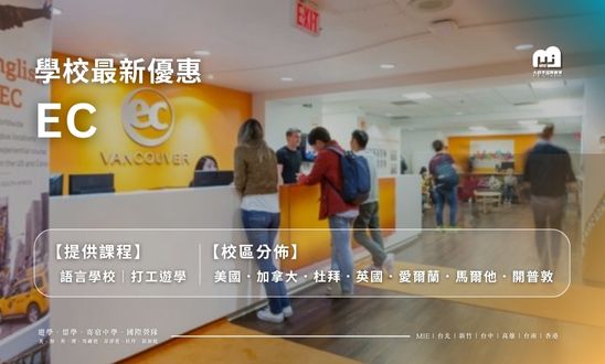 * 以上優惠EC全球校區通用:美國、加拿大、英國、愛爾蘭、馬爾他、南非、澳洲、紐西蘭
