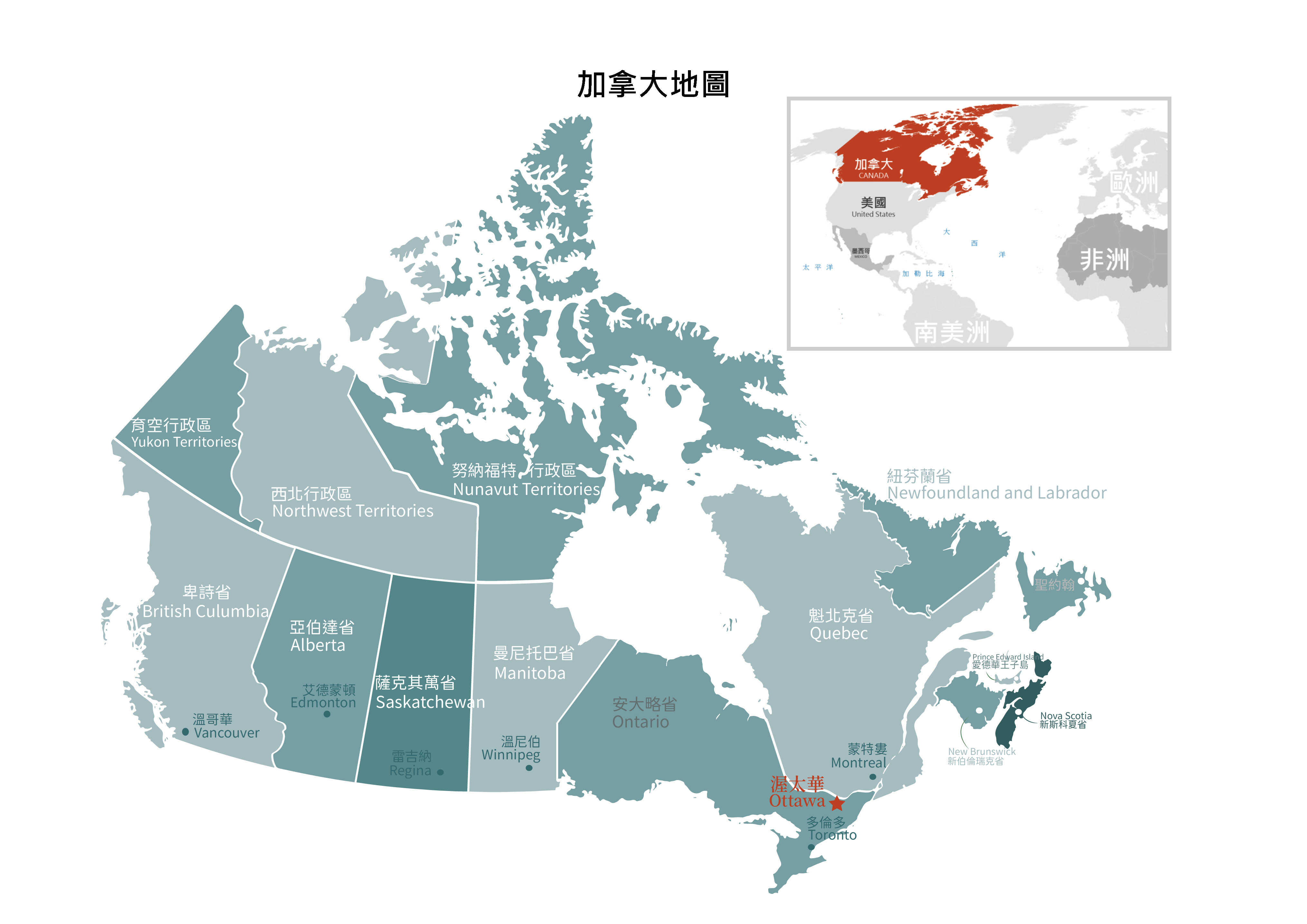 首都及主要都市:首都渥太華(Ottawa);其他如:溫哥華、多倫多、魁北克、蒙特婁、卡加利等。